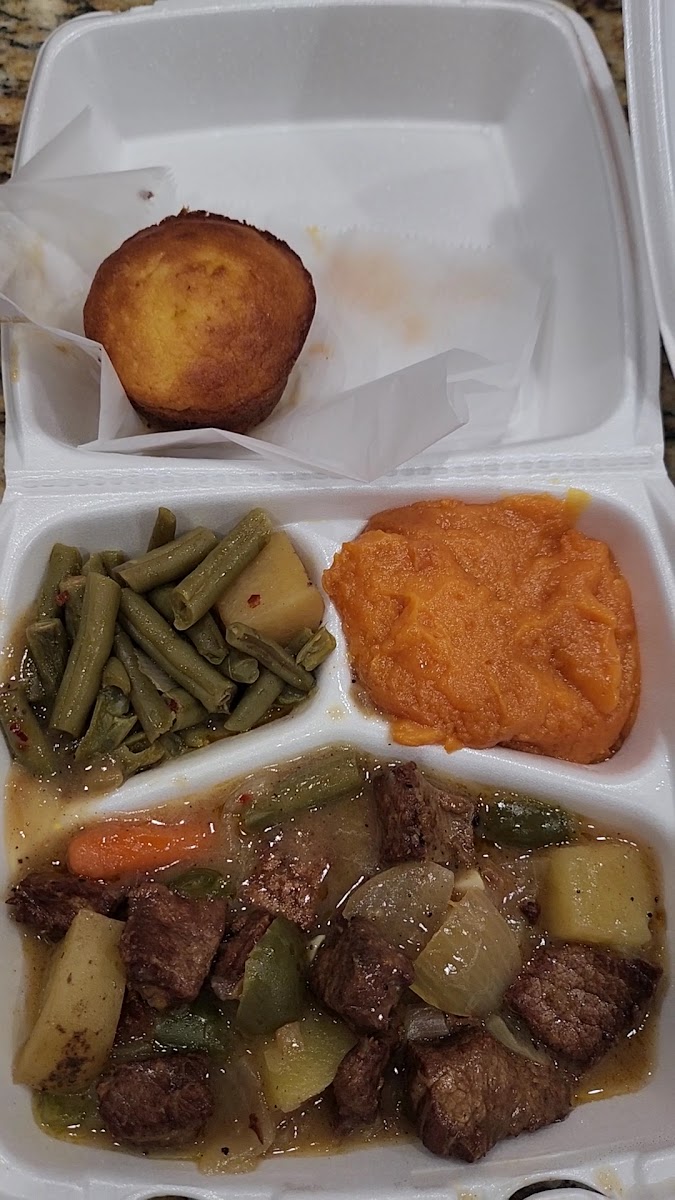 Excellent service, meal full of flavor and love. The turkey Salisbury steaks were perfect, the rice fluffy, the cabbage was succulent with a hint of spice and the sweet potato soufflé was delicious!