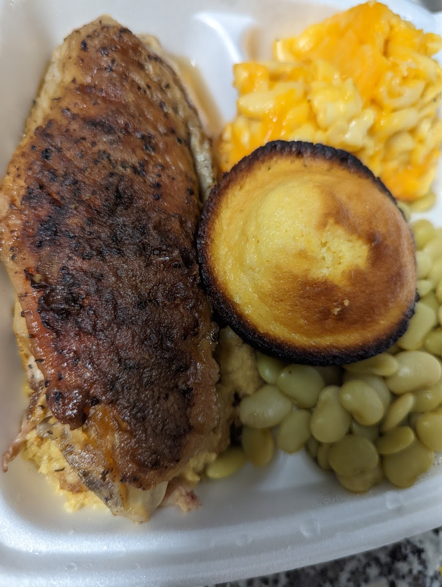 This was my third time here. I purchased the 2 piece fried pork chops with collard greens and Mac & cheese. The plate also comes with a corn muffin. The food was good, seasoned well and the pork chops fried to perfection. I will say that I think the mac & cheese was a tad bit dry. This purchase was about $18. The employee who took my order was very professional and polite. I will definitely purchase from here again.